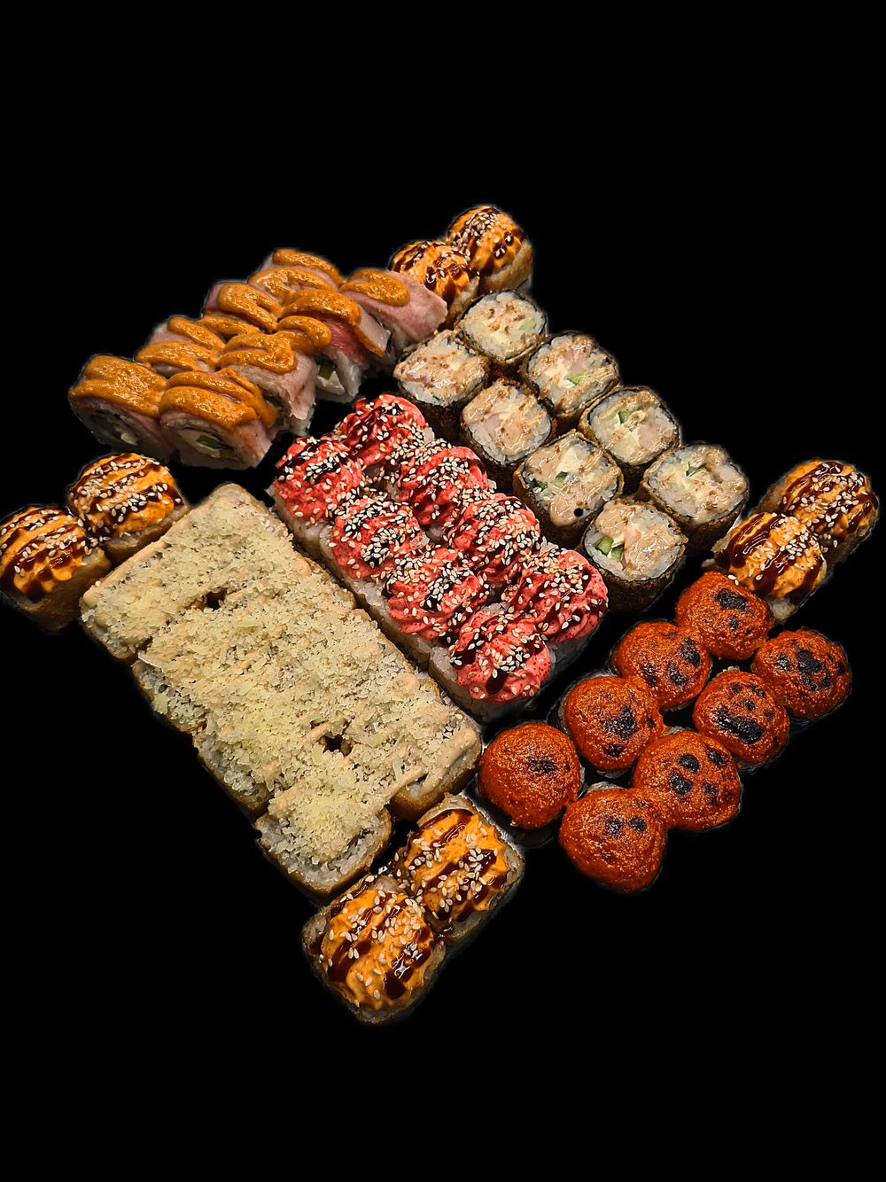 Запечённый ролл «Бекон», ролл «Токио», ролл «Сяке Лава», ролл «Цезарь Темпура», ролл «Горячий» с креветкой, ролл «Острая креветка » 48 шт.