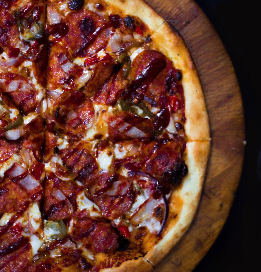 Соус томатный, бекон, пеперони, моцарелла, перец болгарский, красный лук, халапеньо, соус кимчи