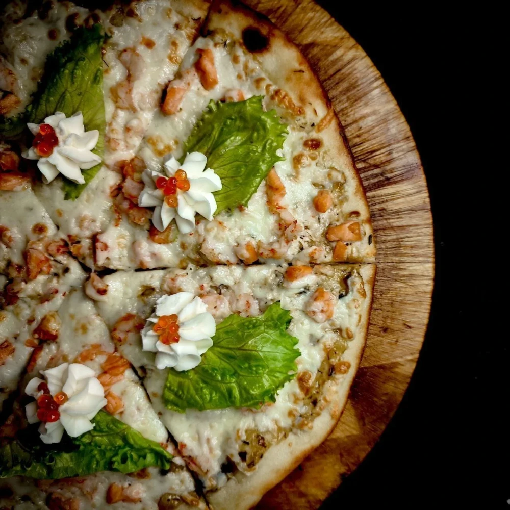 Чесночно-грибной соус, креветка, лосось, помидор, моцарелла, лист салата,сливочный сыр, икра лососевая