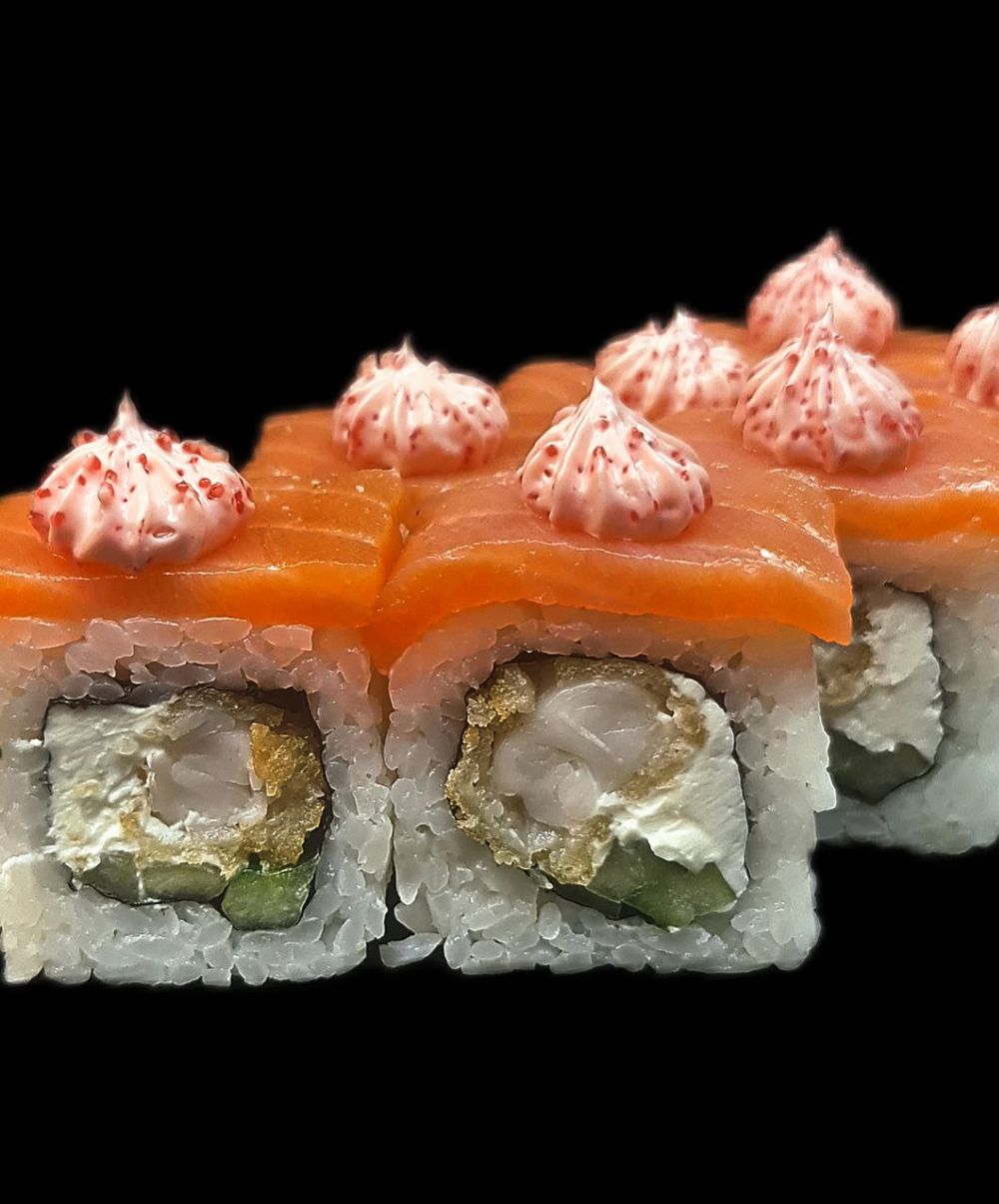 Ролл с нарезкой лосося, сливочным сыром, креветкой темпура, свежим огурчиком, украшен соусом лава