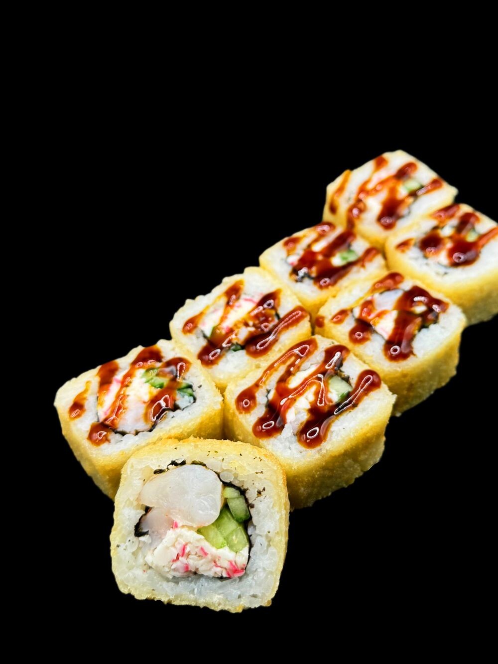 Жареный ролл с креветкой, крабовым сурими, огурец, унаги соус