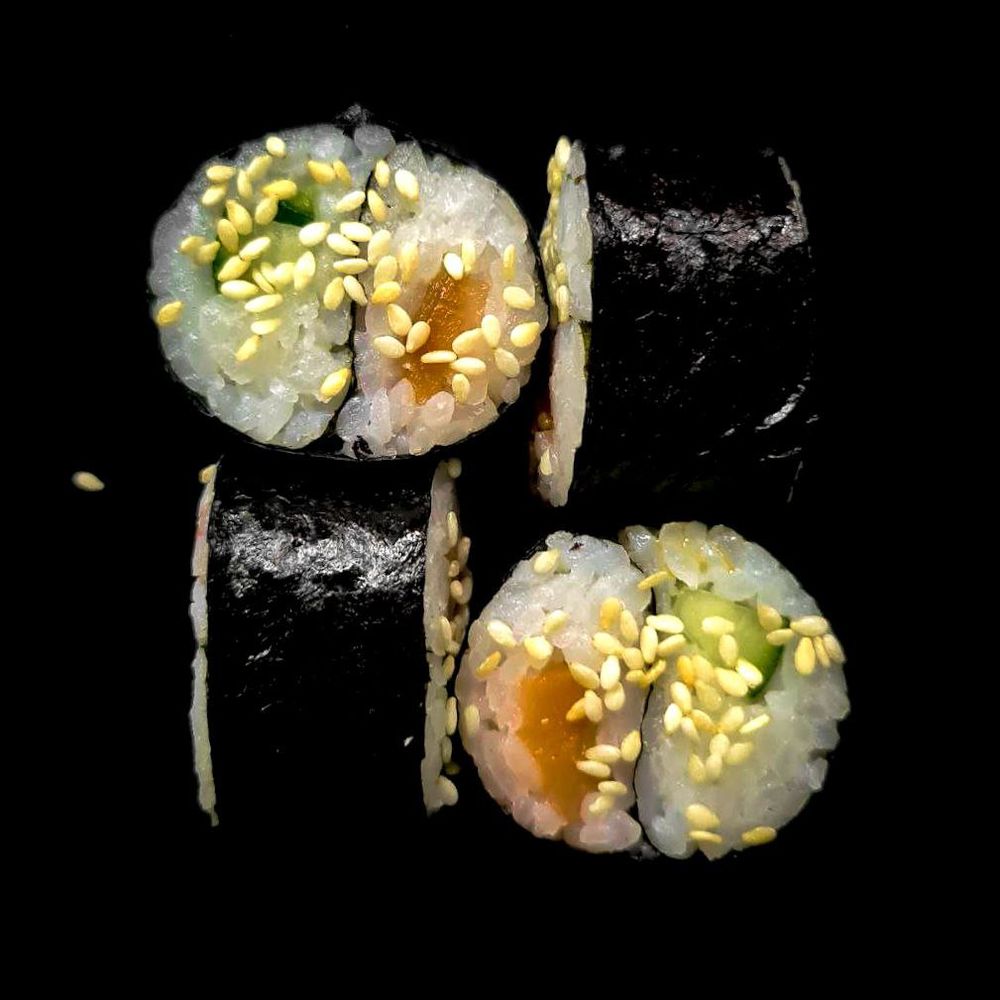 Ролл с копчёным лососем ,огурец ,кунжут