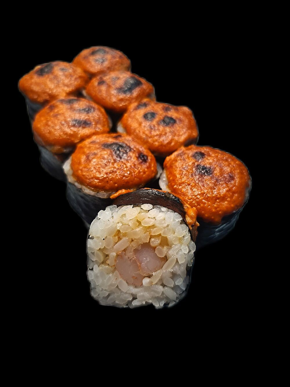 Креветка ,соус спайси ,под шапочкой соуса яки и кимчи .