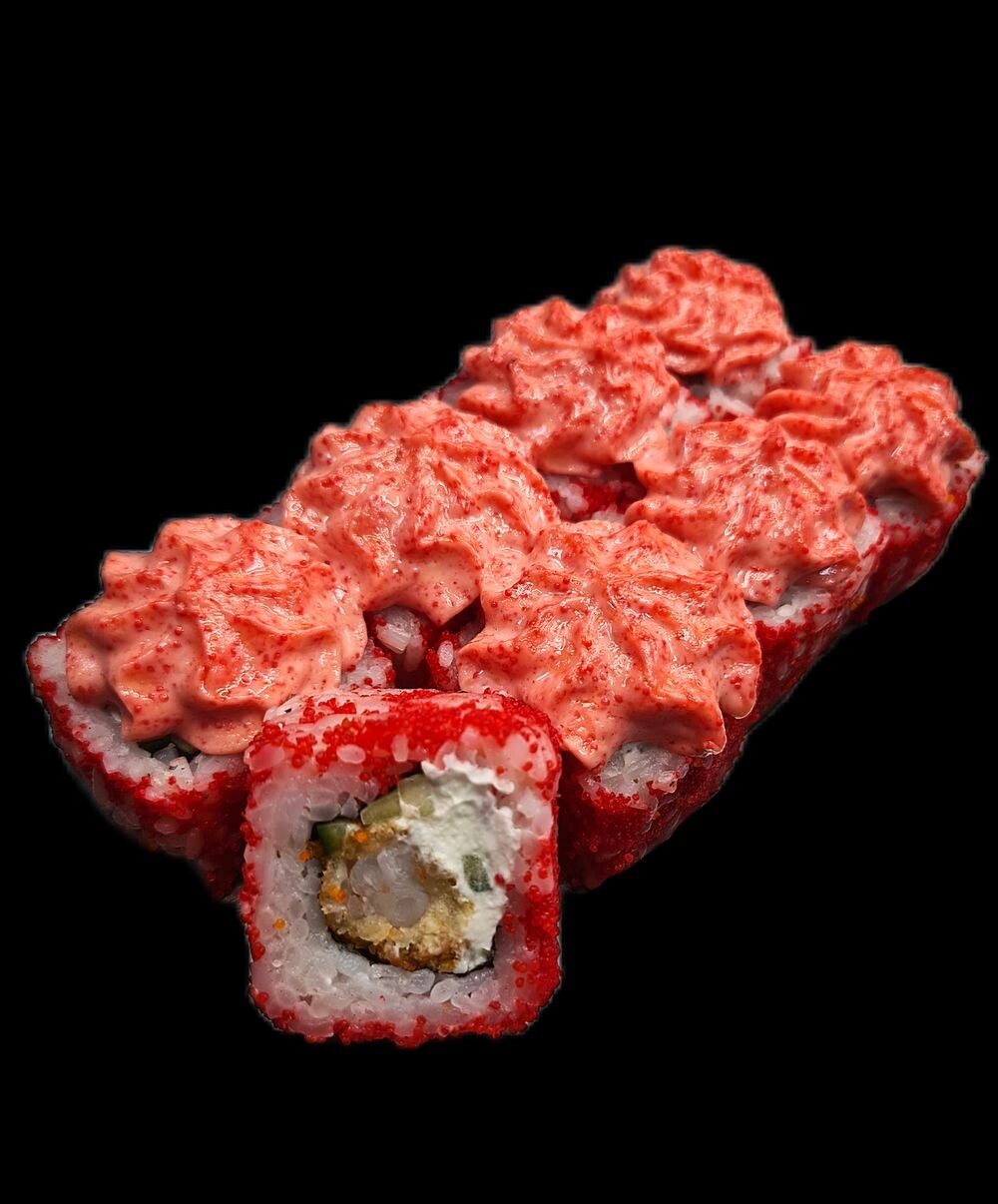 Креветка темпура , сливочный сыр ,огурец ,икра масаго ,соус лава.
