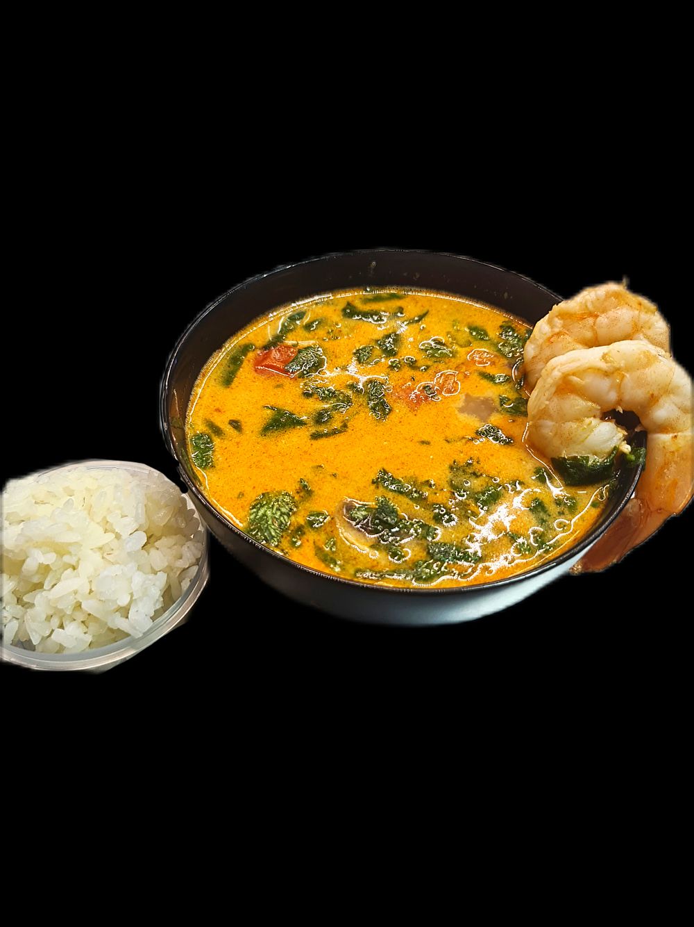 Умеренно острый тайский суп , на основе пасты том ям и кха , кокосового молока , лемонграсс , кинза, помидоры черри , шампиньоны , филе грудки , подается с рисом .