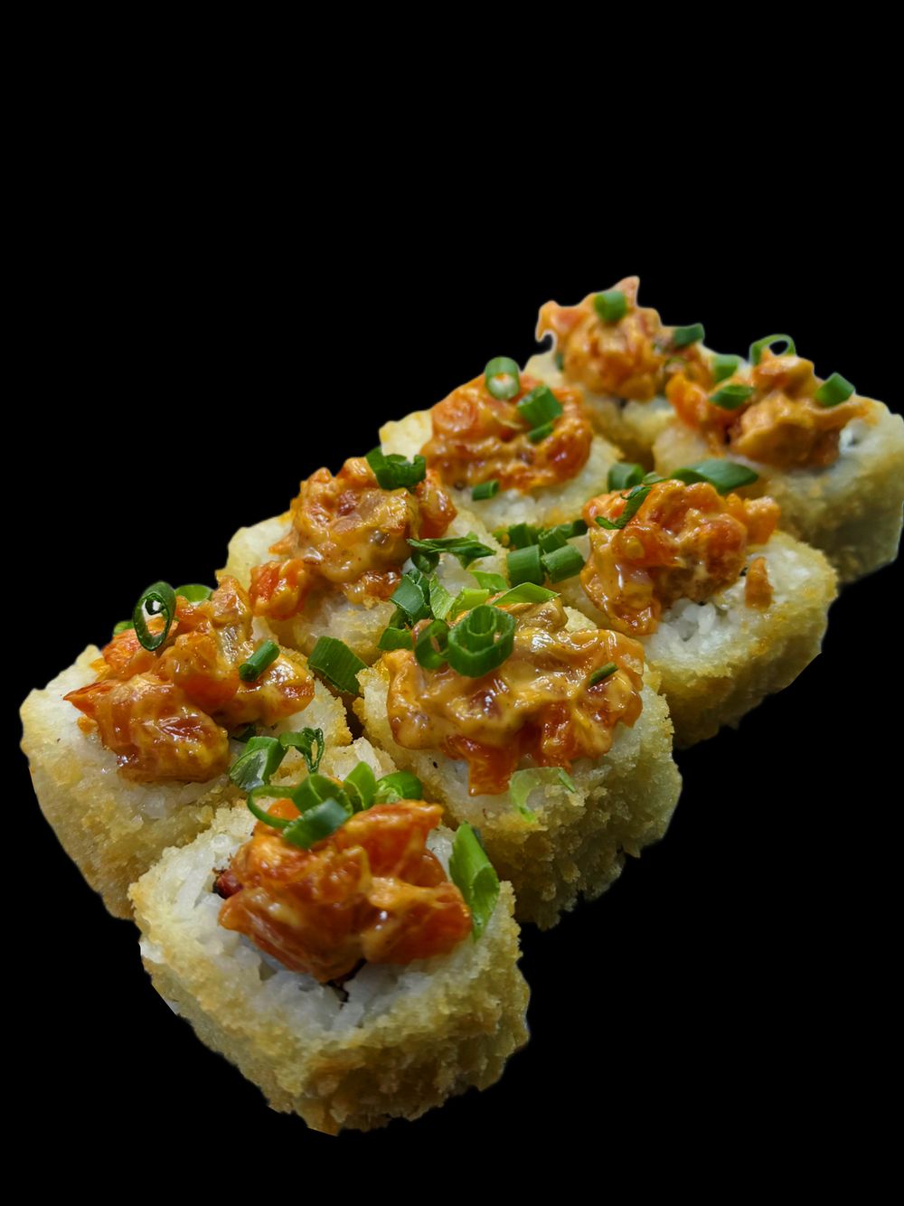 жареный ролл с сливочным сыром , помидор, лосось , соус спайси , лук зеленый , кунжут .