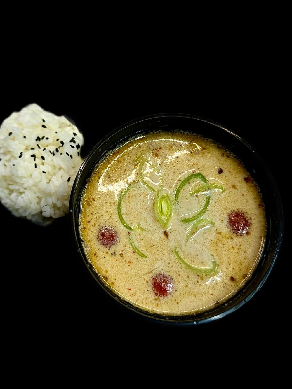 Фирменный суп , сливки , паста Том кха, лосось , лук красный , морковь ,чеснок , соевый соус , черри, лемонграсс, шрирача , стружка тунца , лук порей , специи , продается с рисом .