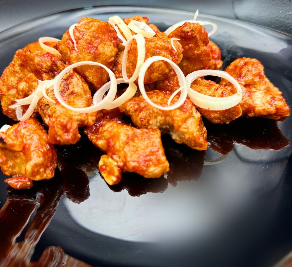 Хрустящие снаружи и сочные внутри , филе курицы в фирменном соусе Данман , арахис , лук порей .
