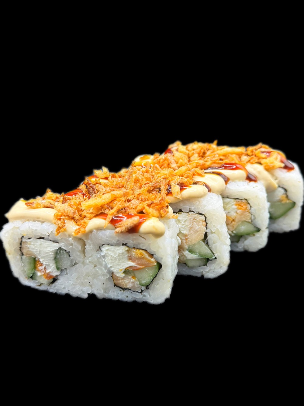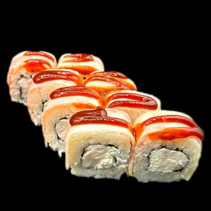 Сливочный сыр, курица копченая, огурец, соус цезарь, соус унаги, лук фри.