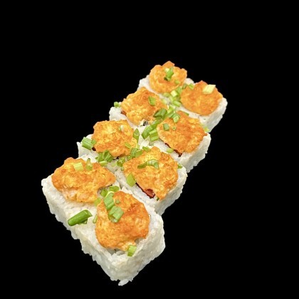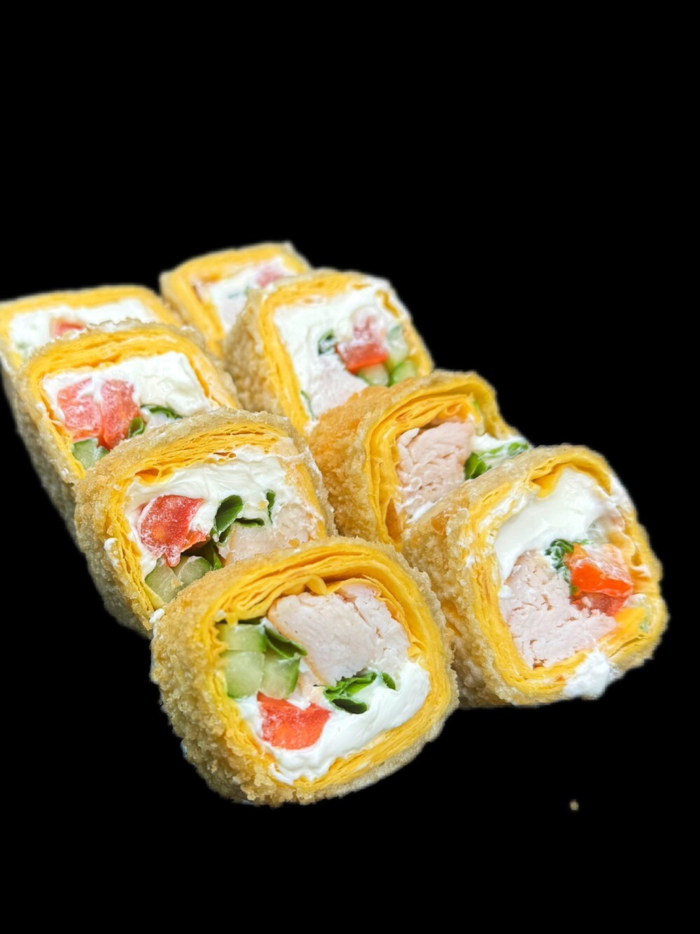 Ролл со сливочным сыром, копченая курица, помидор, огурец, лук зеленый.