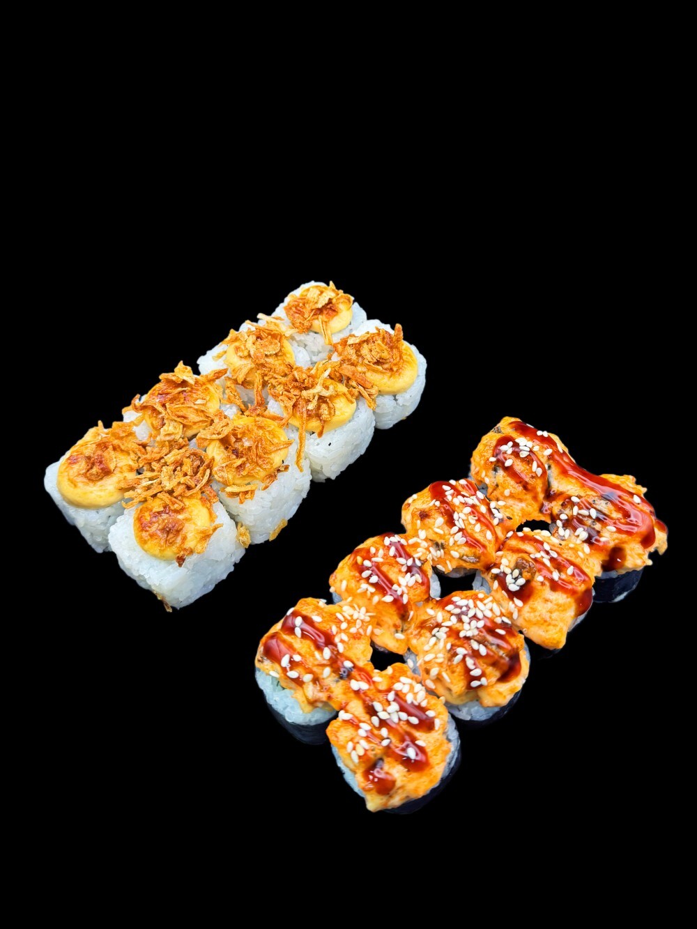 Запеченный ролл со сливочным сыром, огурец, шапочка с угрем и Яки соусом, унаги соус, кунжут + запеченный ролл с копченой курицей, помидор, соус цезарь, лук фри.