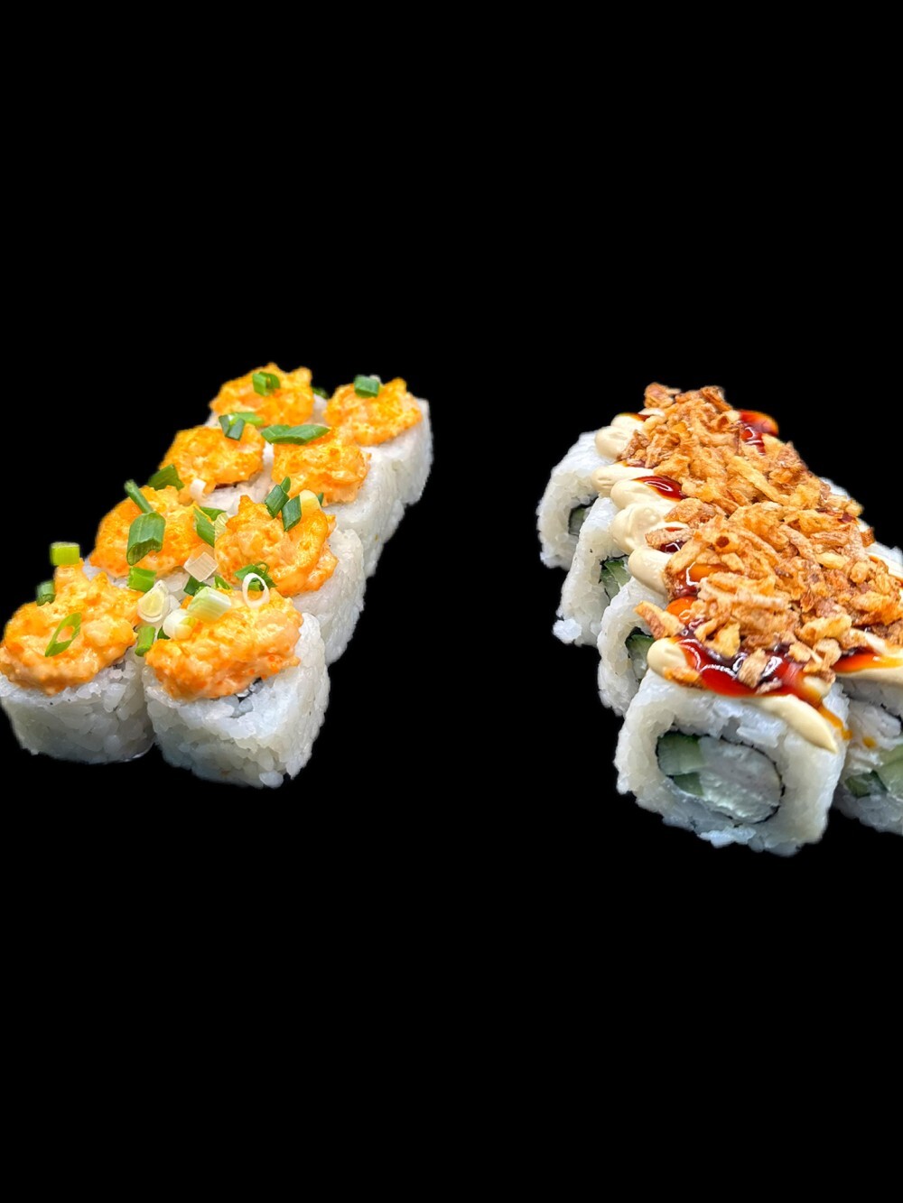 Запеченный ролл со сливочным сыром, помидором, фирменный соус с креветкой, зеленый лук + ролл со сливочным сыром, копченой курицей, огурец, соус цезарь, унаги соус, лук фри.