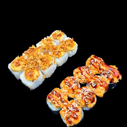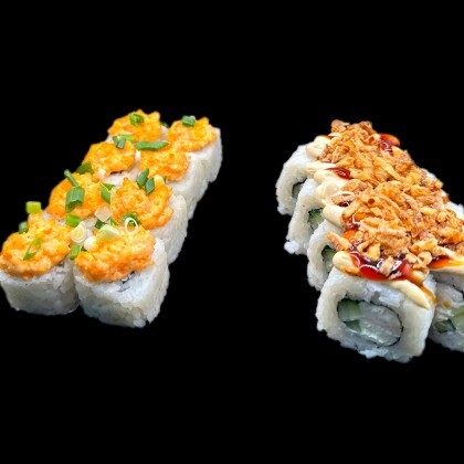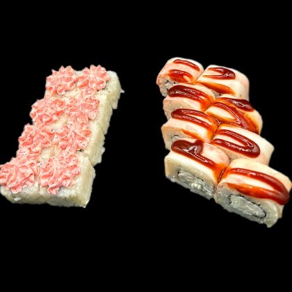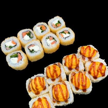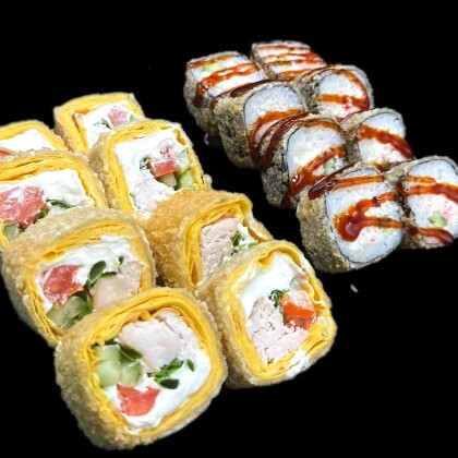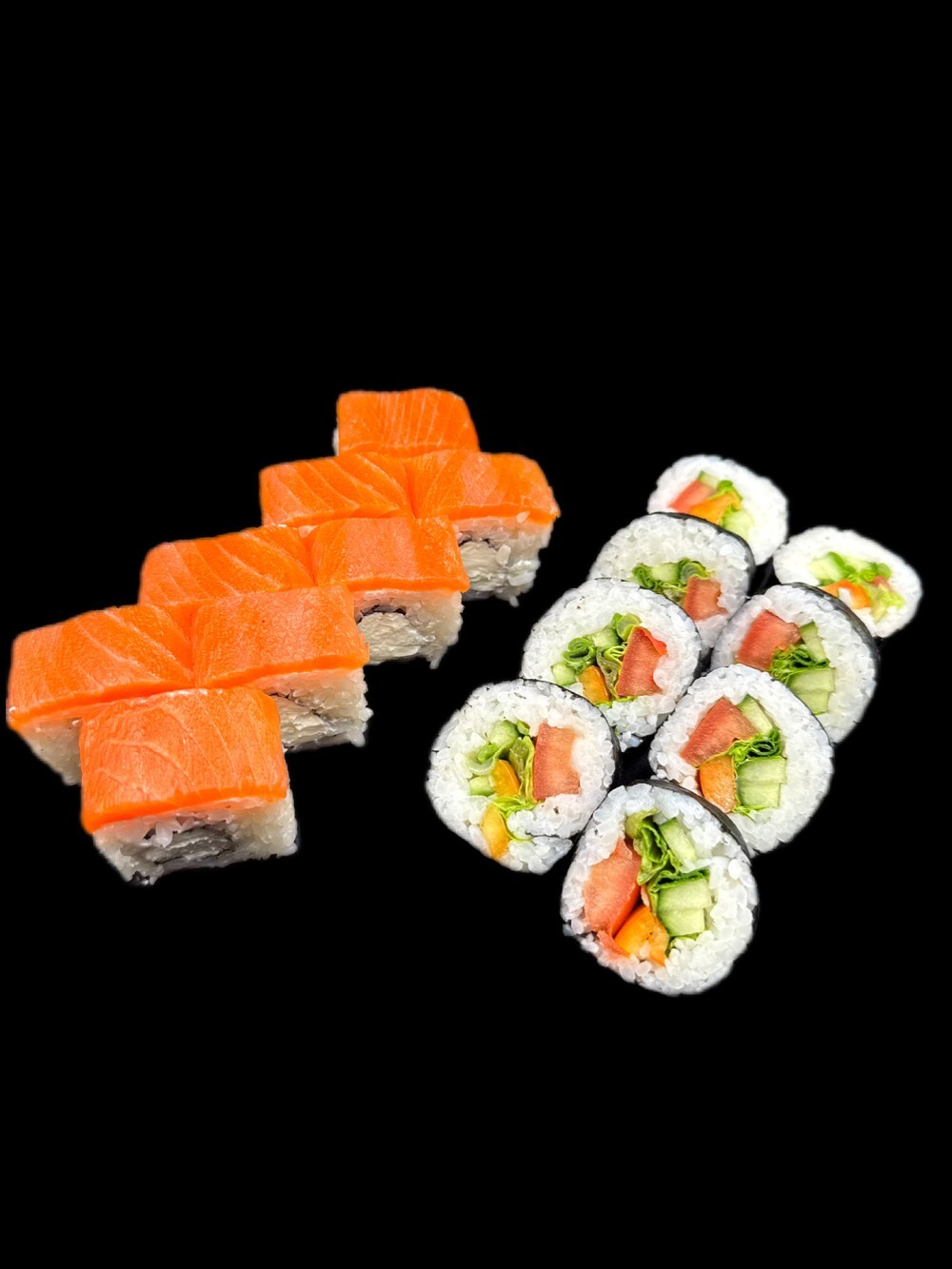 Ролл с нарезкой лосося, сливочный сыр + ролл с огурцом, болгарский перец, помидор, лук зеленый, лист салата.