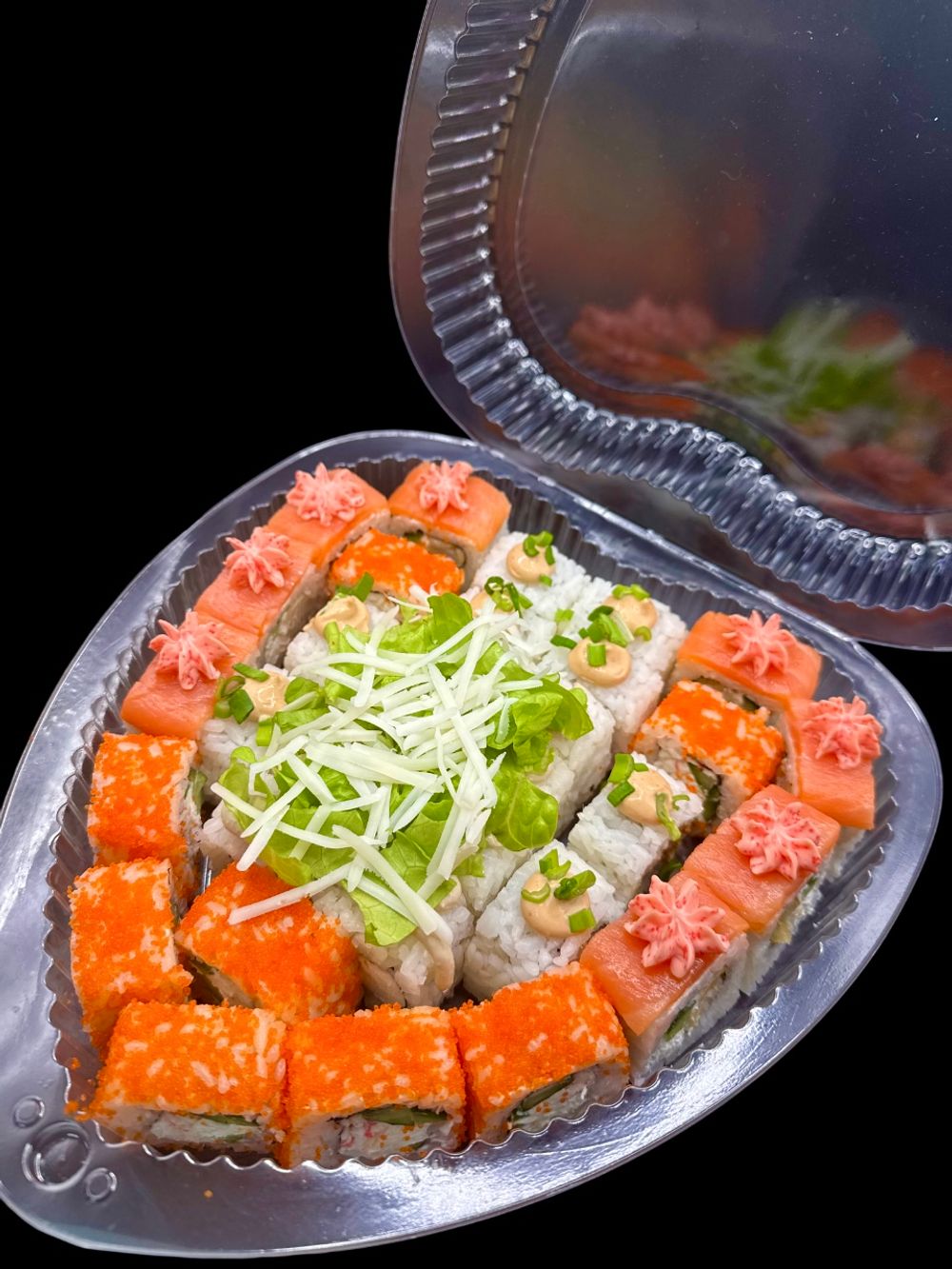 Ролл Эби Фьюжен( лосось Терияки,креветка,краб сурими, соус Спайси, лук зеленый), Ролл Любимый, Ролл Калифорния Кани, Ролл Цезарь с добавлением сыра пармезан.