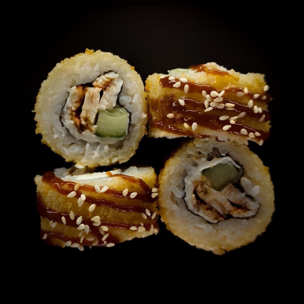Сливочный сыр, угорь, огурец, унаги соус, кунжут